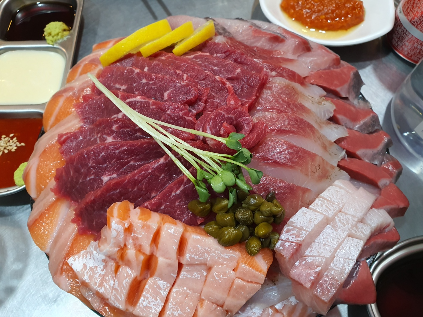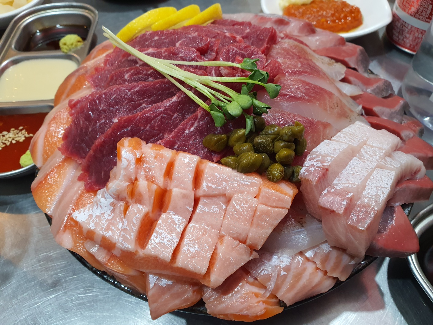 첫 번째로는 합정역 3번 출구 쪽에 위치한 광안리라는 횟집입니다. 부산 광안리에 본점이 있다고 하는데 서울에서도 맛볼 수 있어서 좋았어요. 가게 안 분위기도 좋고 무엇보다 맛이 일품이었습니다. 생연어회랑 육반연반이라는 메뉴인데 연어 좋아하시는 분들은 정말 좋아하실 듯하네요. 다만 테이블이 많지 않아 주말 같은 경우엔 웨이팅이 있을 수도 있으니 참고하시길 바랍니다.