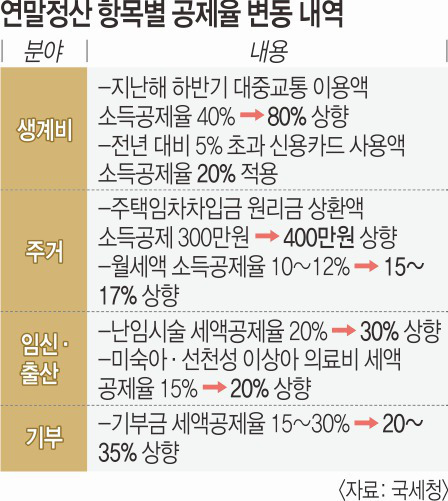 저출산 문제 해결을 위해 특정 의료비 공제율도 높게 적용된다. 난임시술비 공제율은 기존보다 10% 포인트 상향한 30%를 적용받는다. 미숙아나 선천성 이상아를 위해 지출한 의료비 공제율도 현행 15%에서 20%로 높인다. 기부금 공제율도 지난해와 마찬가지로 한시 상향 적용한다. 지난해 지출한 기부금 중 1000만원 이하 금액은 20%, 1000만원 초과 금액은 35% 세액공제를 받는다. 저조한 기부 문화 반등을 위해 한시 상향 기간을 1년 더 연장했다.